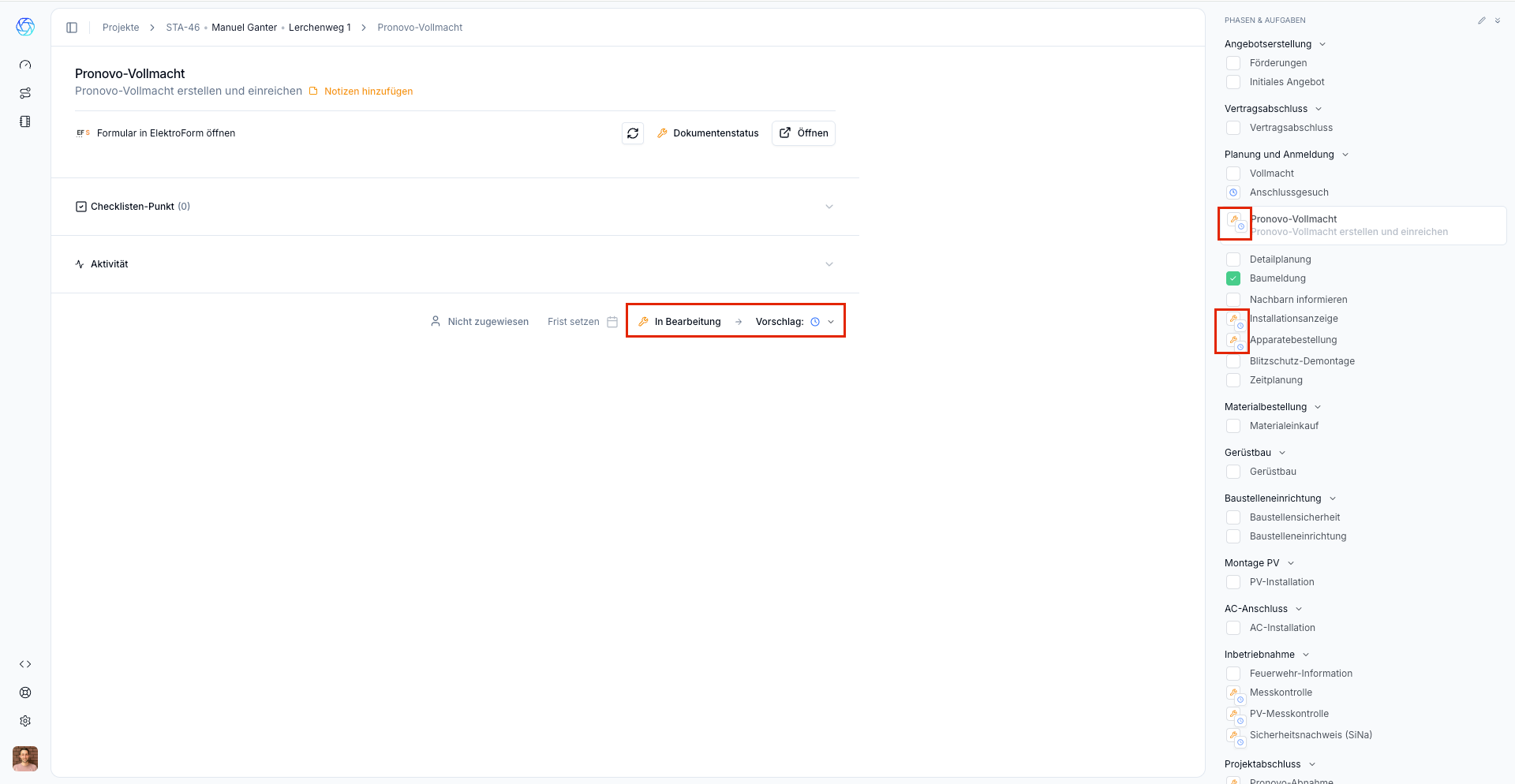 1. Die Aufgabe “Technisches Anschlussgesuch” ist “In Bearbeitung”, aber wir bekommen vom ElektroForm solar die Meldung, dass das TAG nun genehmigt wurde. In diesem Fall erzeugen wir einen Vorschlag, die Aufgabe auf “Abgeschlossen” zu stellen.