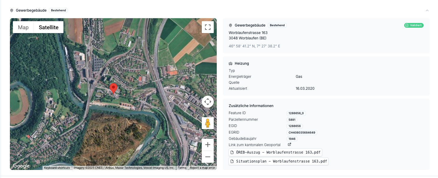 Wir haben die Geodaten Sektion etwas erweitert. Neben Gebäudebaujahr und Rennovationsjahr zeigen wir euch nun auch einen Direktlink ins kantonale Geoportal an. Ausserdem erzeugen wir euch den Situationsplan und den ÖREB Auszug. Ausserdem gibt es kleine Änderungen im Notizfeld und bei den Status des ElektroForm solar.