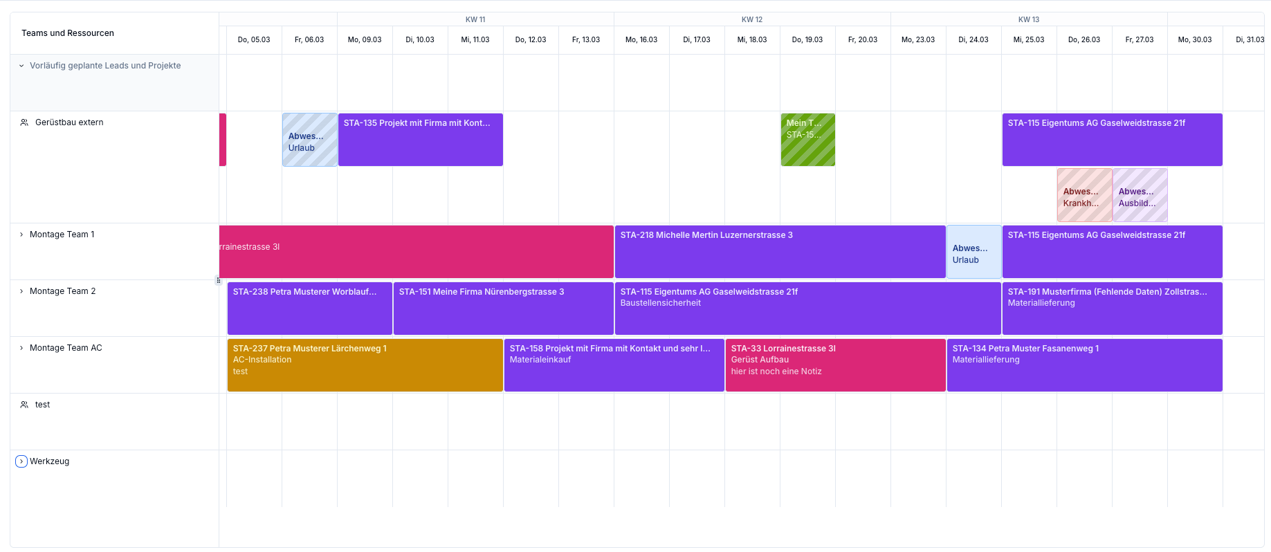 Um euch eine Art “Projektübersicht” über die Zeit anzuzeigen, könnt ihr die Ansicht nun auch “nach Projekt gruppieren”. In dieser Ansicht entspricht jeder Zeile einem Projekt und ihr seht übersichtlich in einer Reihe, wann welche Tätigkeit bzw Bauphase für welche Projekt geplant ist.